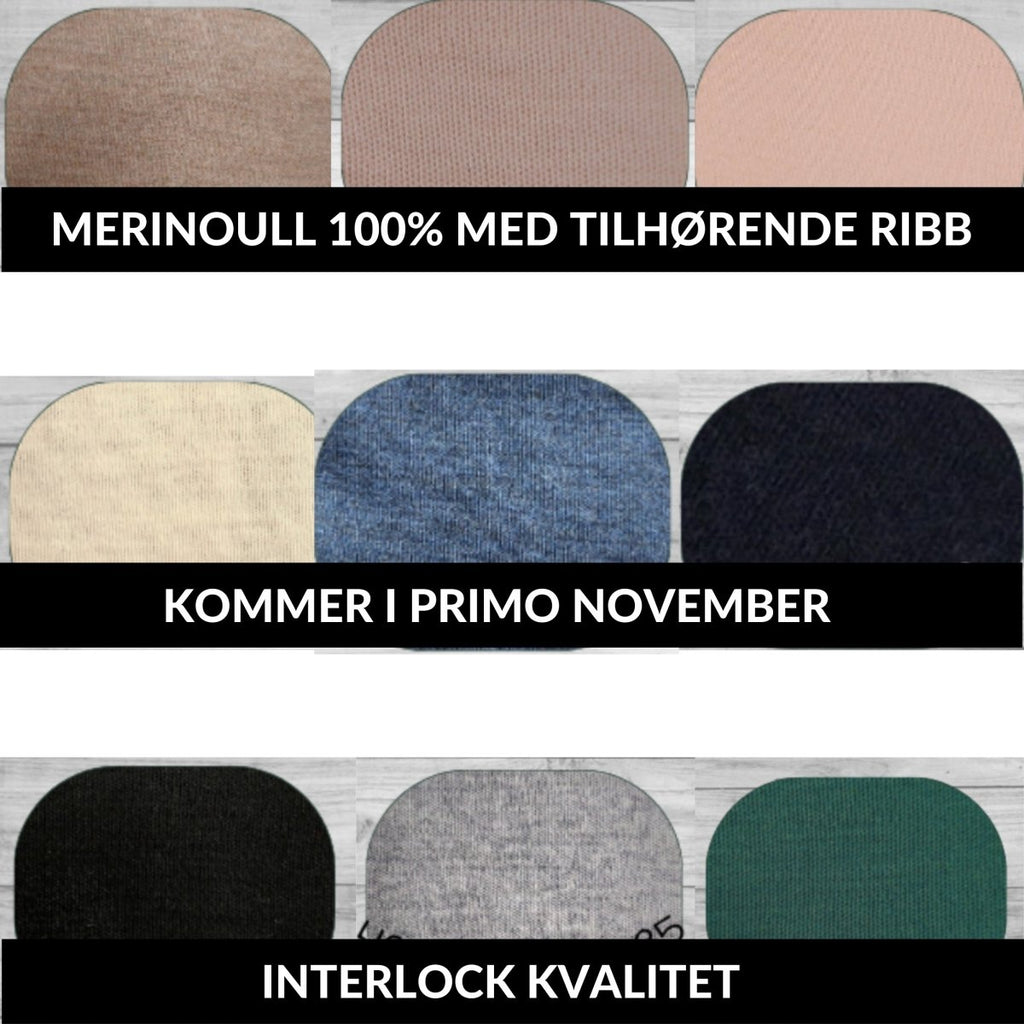 Vi har bestilt inn merinoull 🐑 i 100% interlock kvalitet i mange nydelige farger. Fargene vi har bestilt inn og som nå er i produksjon er: sage (grønn), latte, black, melange light grey, off white, jeans, melange beige, deep blue, old rose. I tillegg har vi bestilt inn tilhørende ribb i eksakt samme farger, så du kan sy fine halskanter, erme- og benribb 😃