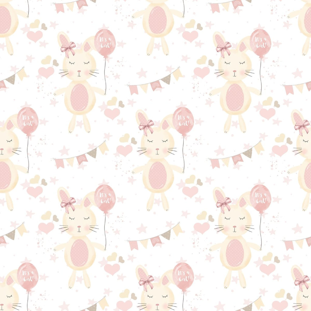 It´s a girl bunny & balloon jersey. Søtt stretch stoff for de minste med kaniner med rosa ballonger med teksten "it´s a girl" på hvit bakgrunn. Sy søte plagg til nyfødt og til babyshowers. 👶