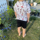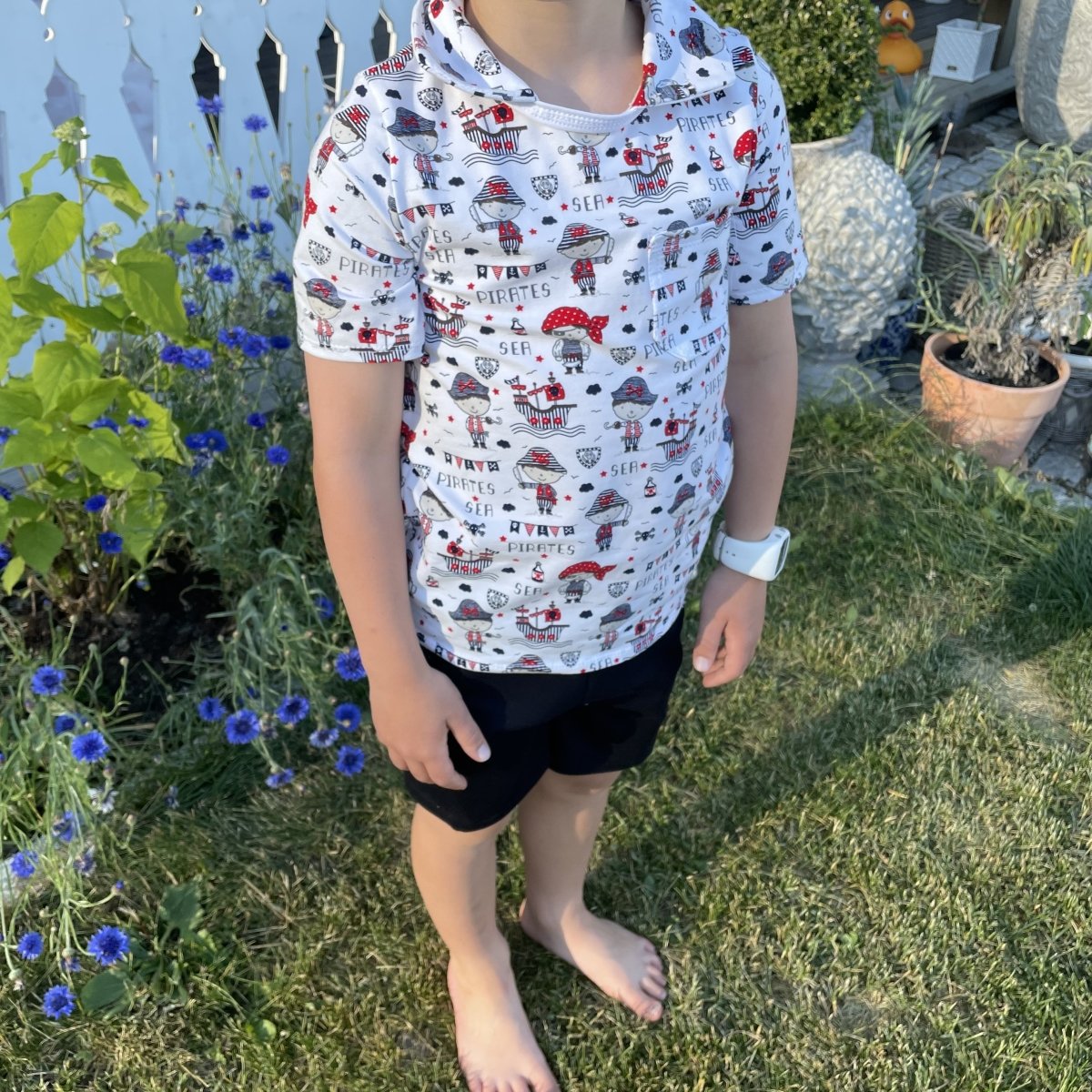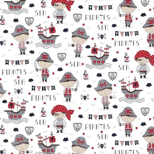 Økologisk Jersey Sjørøvere - hvit farge. Søtt stretch stoff til barn med små sjørøvere på hvit bakgrunn. Vi har også stoffet i mørkeblått.