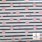 Jersey med blå striper og rosa sirkler på hvit bakgrunn. Sommerlig og søtt stoff til både mor og datter 👚👗👛