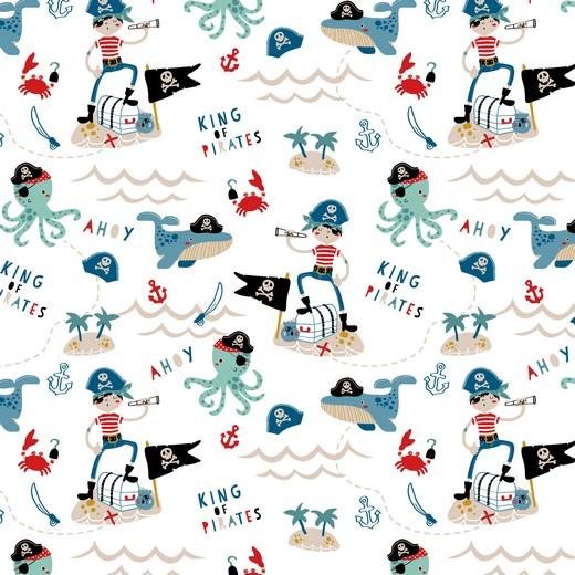 Økologisk Jersey - Små Pirater. Et søtt tekstil til baby og barn med små pirater, hvaler, blekksprut, sjørøverflagg, krabber m.m.