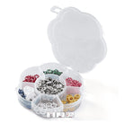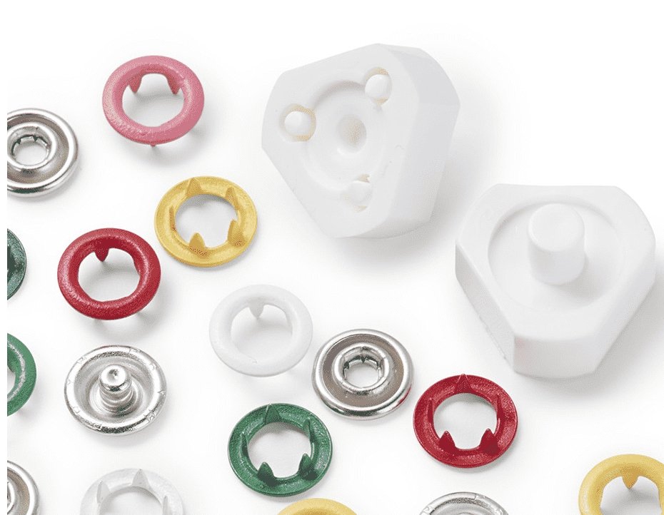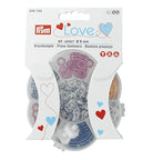 Prym Love – Trykknapp Jersey 8mm. Boks med 60 trykknapper for Jersey stoffer. Fargene er: gult, rosa, grønt, blått, hvit, rødt og sølv.