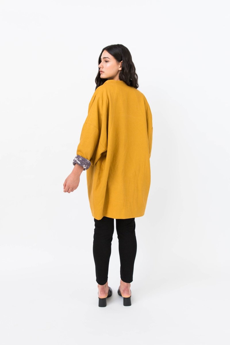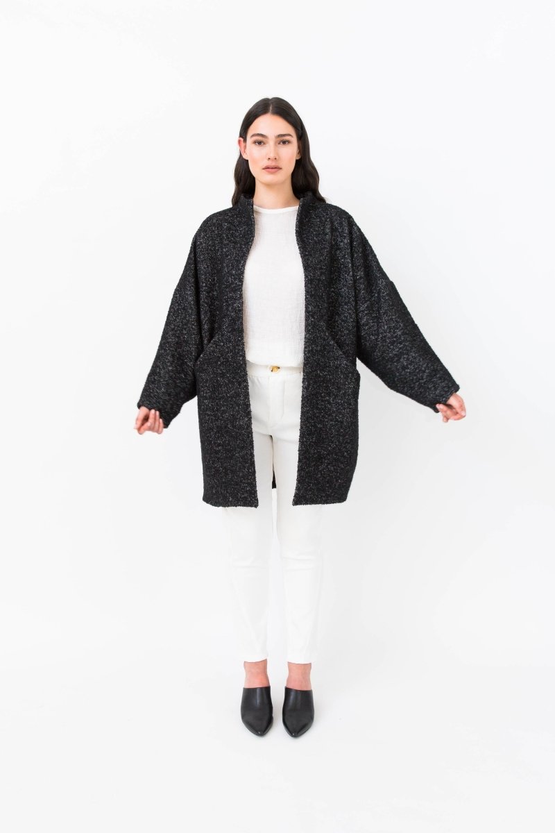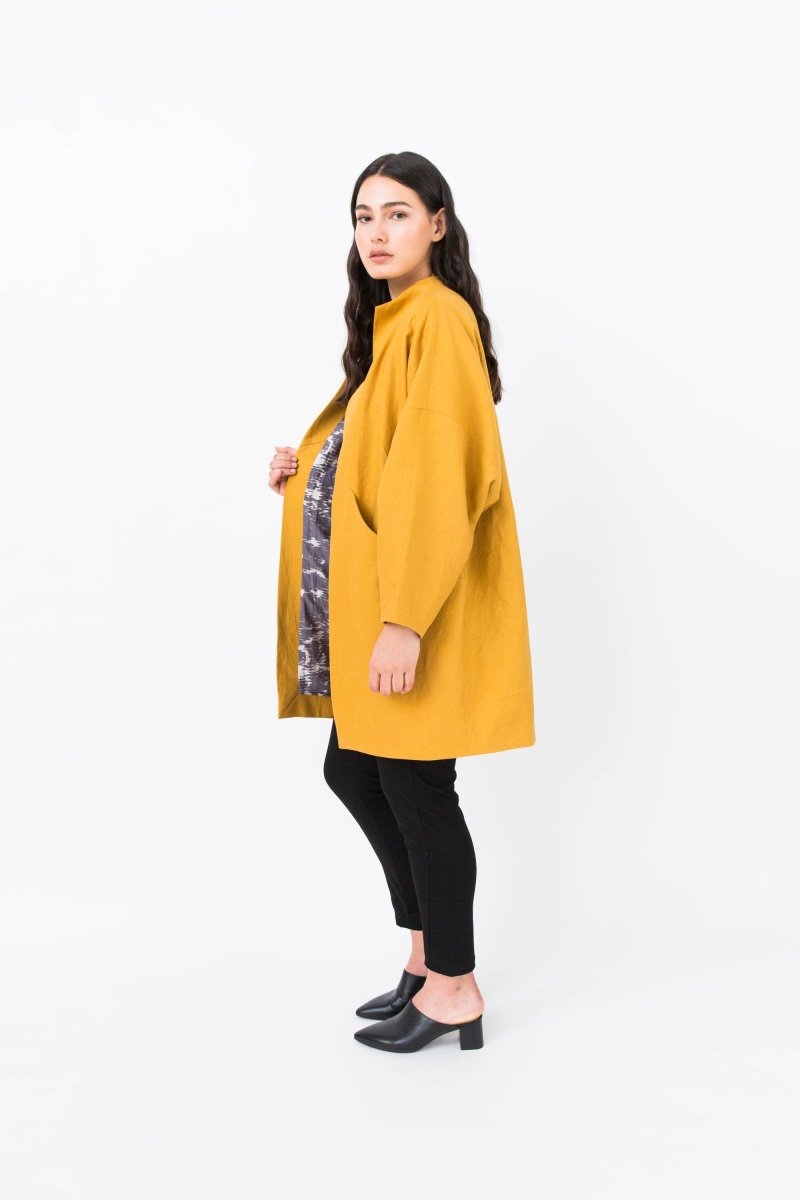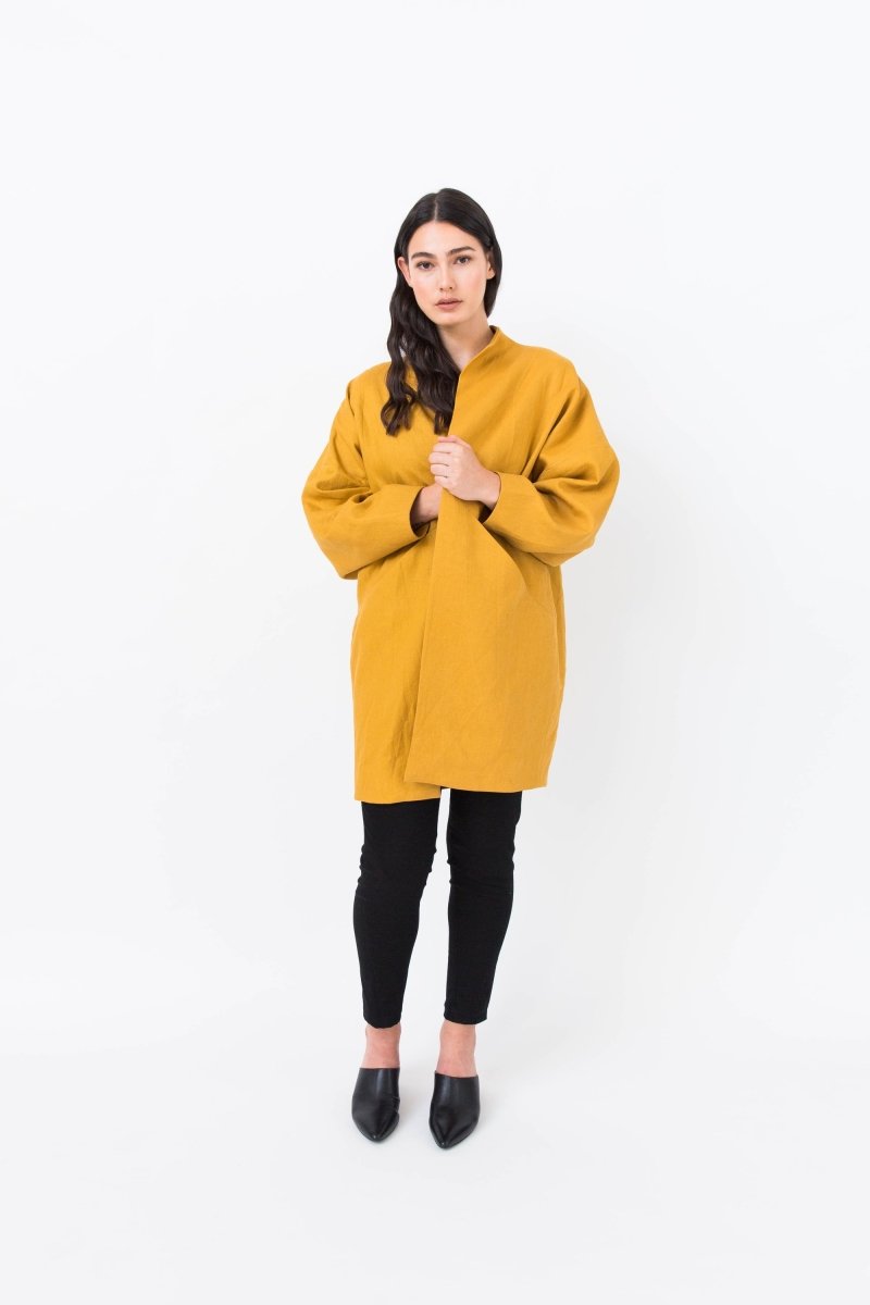 Symønster - Nova Jacket - Papercut Patterns. Bli dristig med vår ikoniske og dramatiske kokongfrakk. Velg et lett stoff for en vår/sommerversjon, eller ull for de kjøligere dagene. Vår fullfôrede Nova har vinklet søm med lommer skjult foran, og er et mønster for hver sesong. Velg mellom beskjærte eller lange ermer, hellakk eller kortere jakke. Det vil være din favorittjakke hele året.